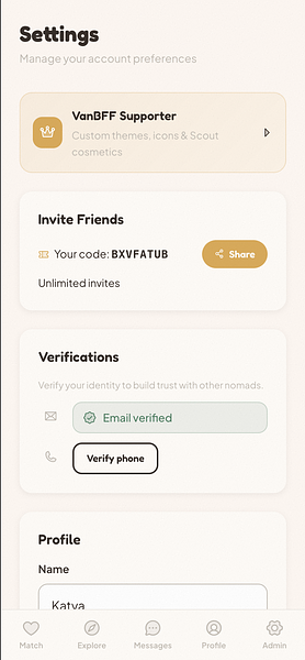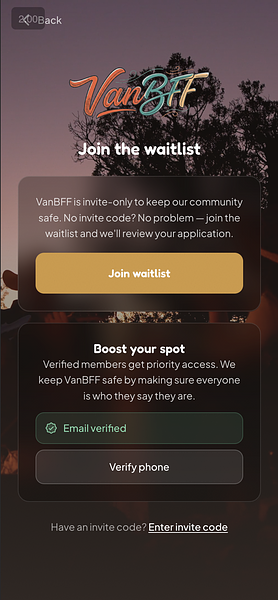 VanBFF is an invite-only social networking app designed exclusively for the van life and nomadic community. It solves a real problem: dating and making friends while living on the road, where traditional apps don’t work because most matches are with people who live in houses.