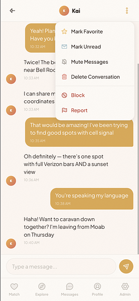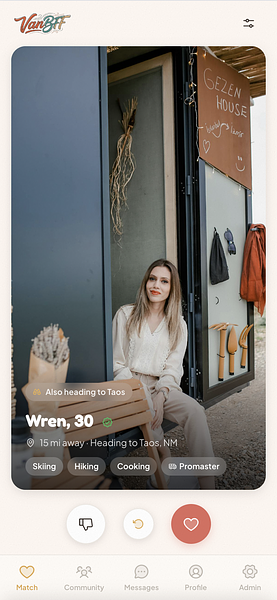 An invite-only social networking app for the van life and nomadic community. Swipe-based matching for dating and friendships, rig profiles, travel plans, and activity-based connections, built for people who live on the road.