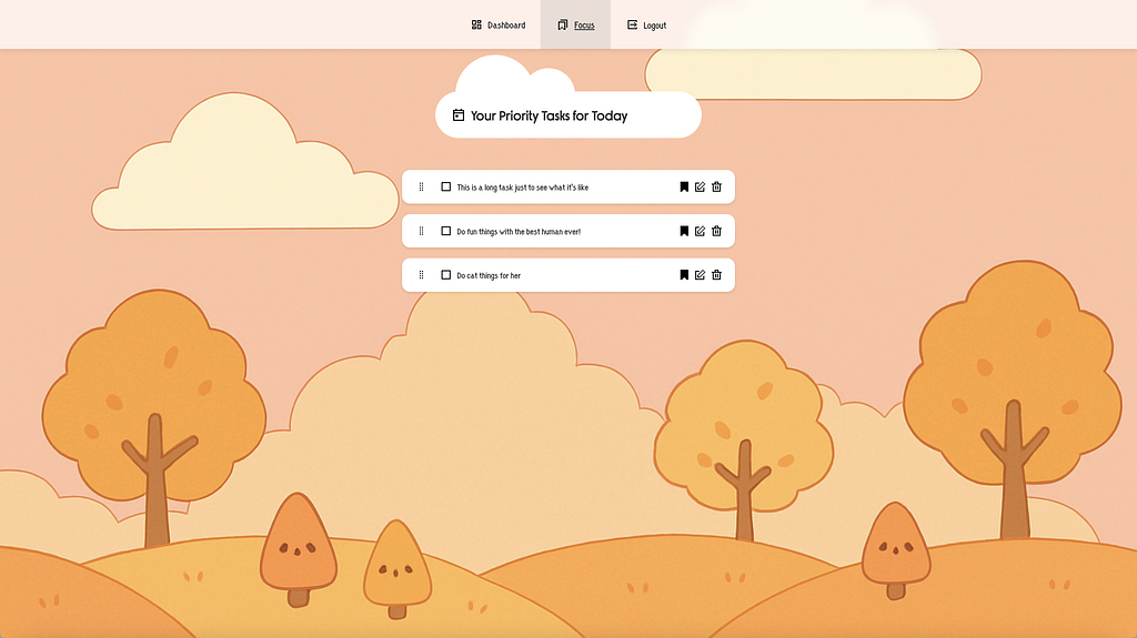 Here is the Focus Page, where I bookmark a few tasks to guide my attention each day. The layout is intentionally simple and cozy so my to-do list feels inviting instead of stressful.