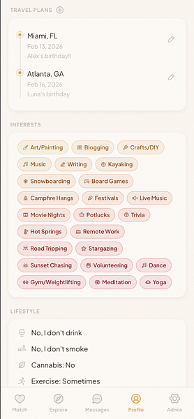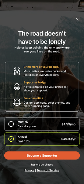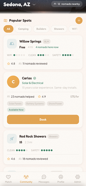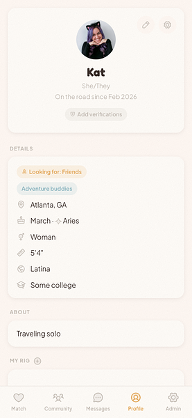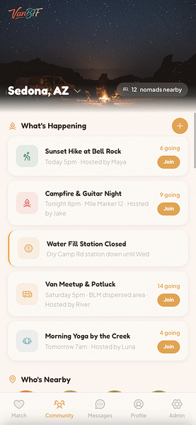 An invite-only social networking app for the van life and nomadic community. Swipe-based matching for dating and friendships, rig profiles, travel plans, and activity-based connections, built for people who live on the road.